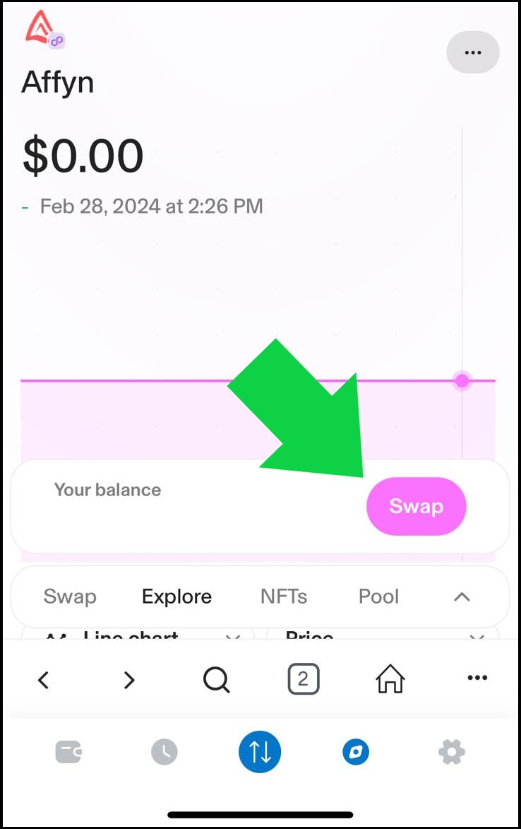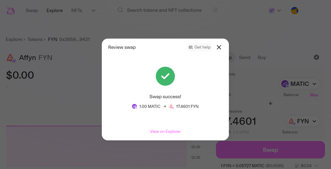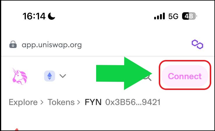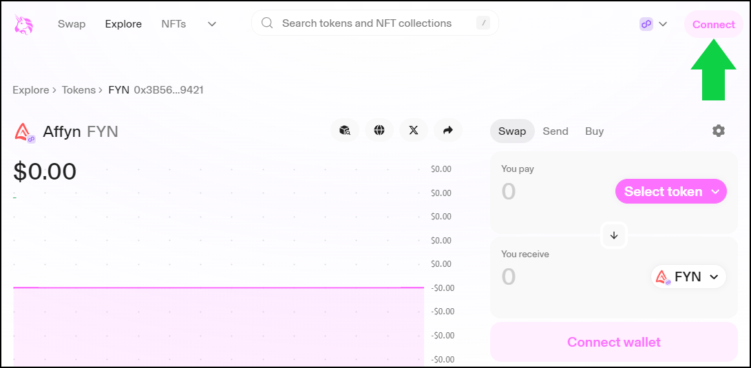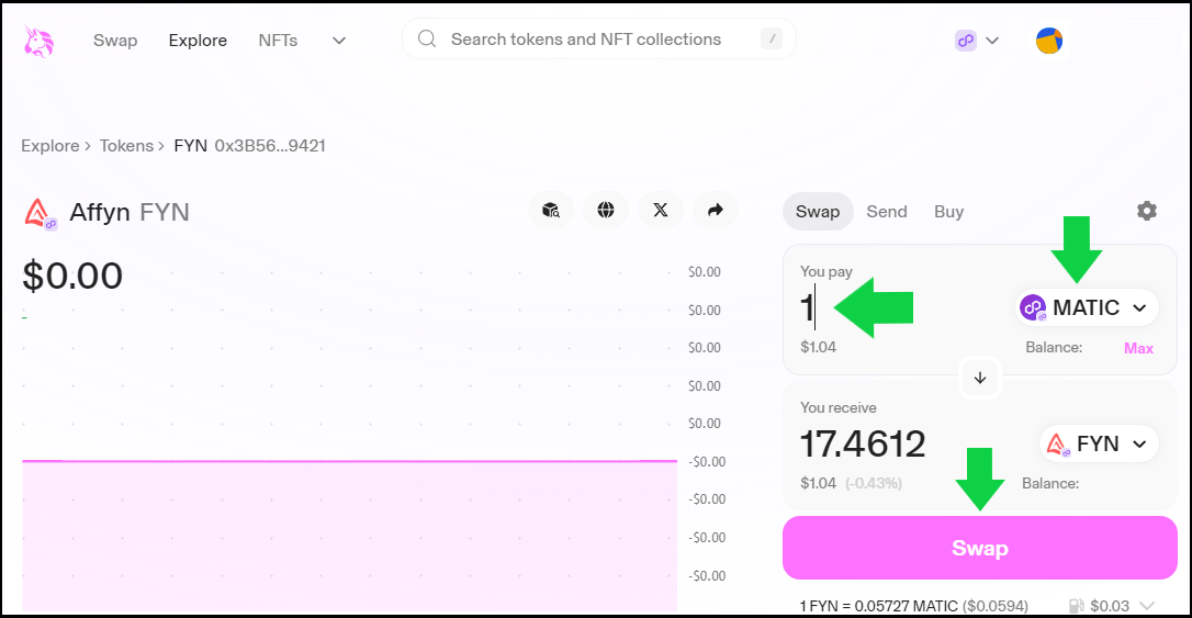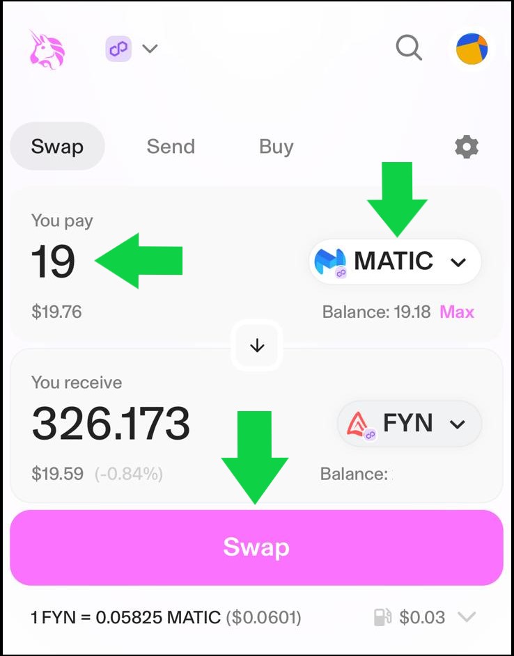 第 6 步:选择您要用于兑换 $FYN 的代币并输入金额,然后选择 Swap