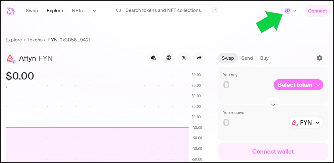 第 4 步:选择您要用于兑换 $FYN 的代币并输入金额,然后选择 Swap