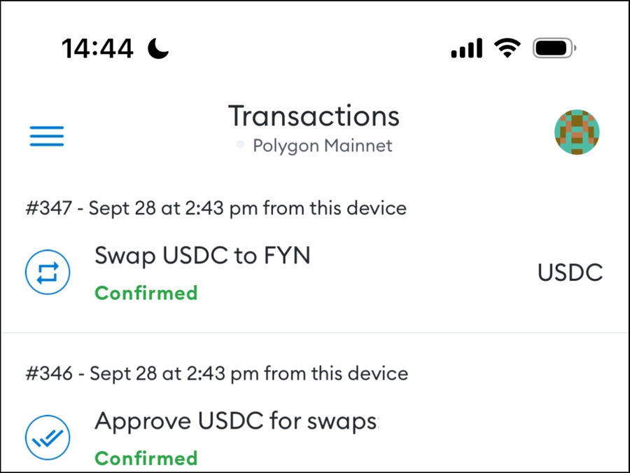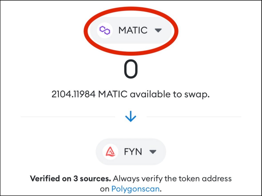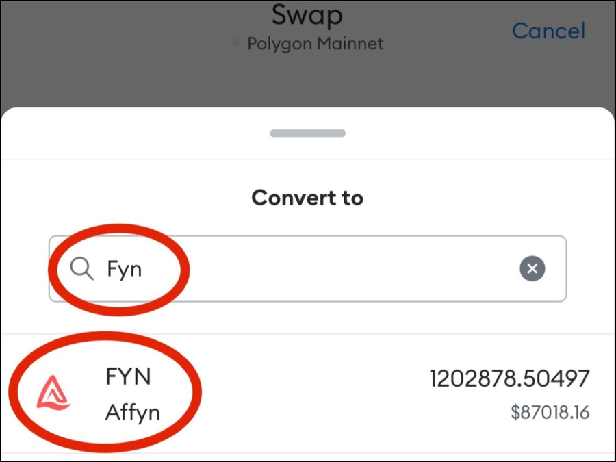 第 7 步:搜索您用于交换到 $FYN 的代币。在此示例中,我们将使用 USDC