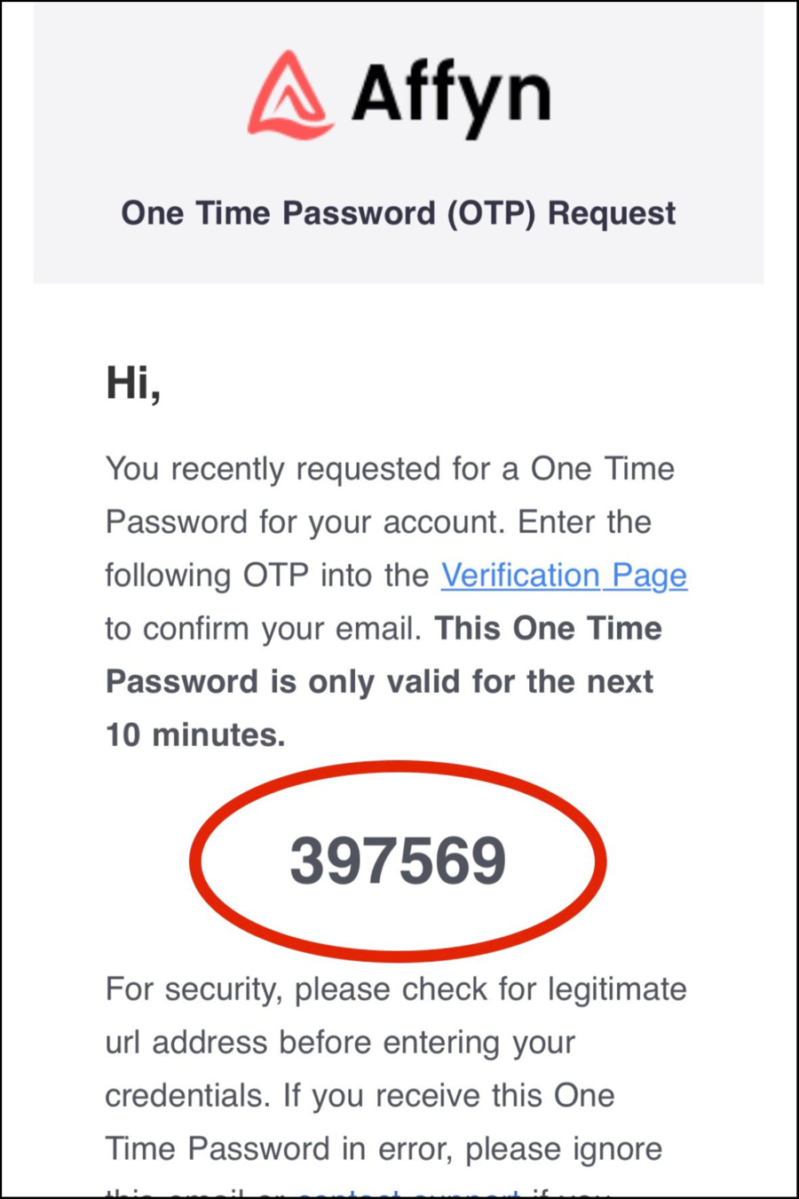 第 5 步:检查您的电子邮件中是否有 Affyn 发送的一次性密码 (OTP)。如果您在收件箱中没有看到该电子邮件,请检查您的垃圾邮件或垃圾邮件文件夹