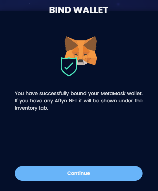 第 6 步:恭喜!您已成功将 MetaMask 钱包绑定到您的 Affyn 账户。选择 Continue