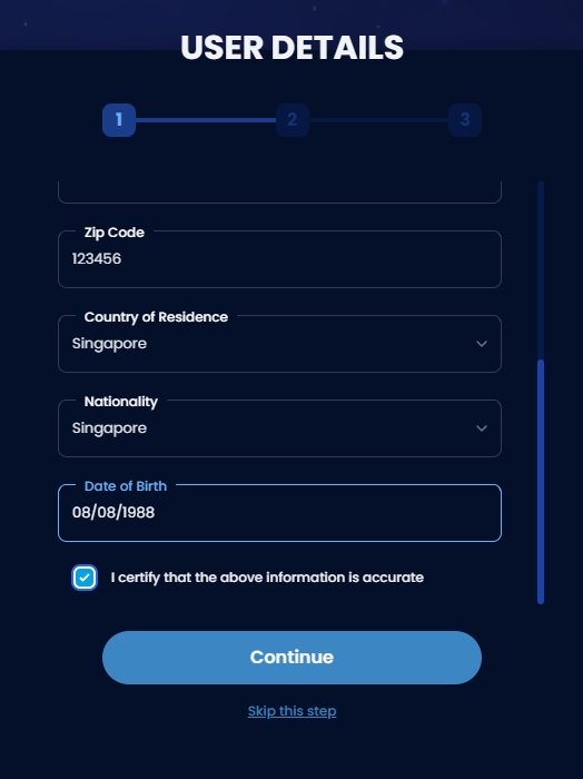 第 4 步:填写您的帐户详细信息和推荐代码(如果有)。勾选 "I have read and agree to the Terms of Use" 复选框,然后选择 Continue