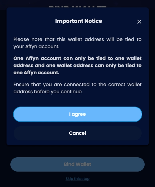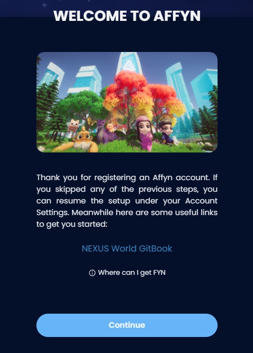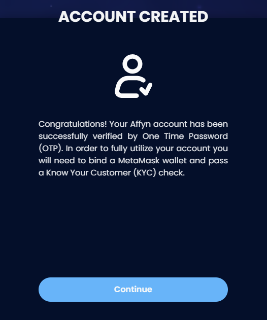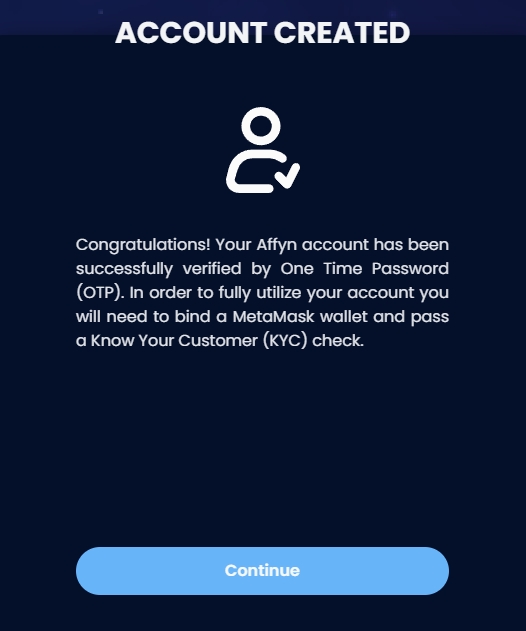 第 7 步:恭喜!您已成功创建 Affyn 帐户。选择 Continue