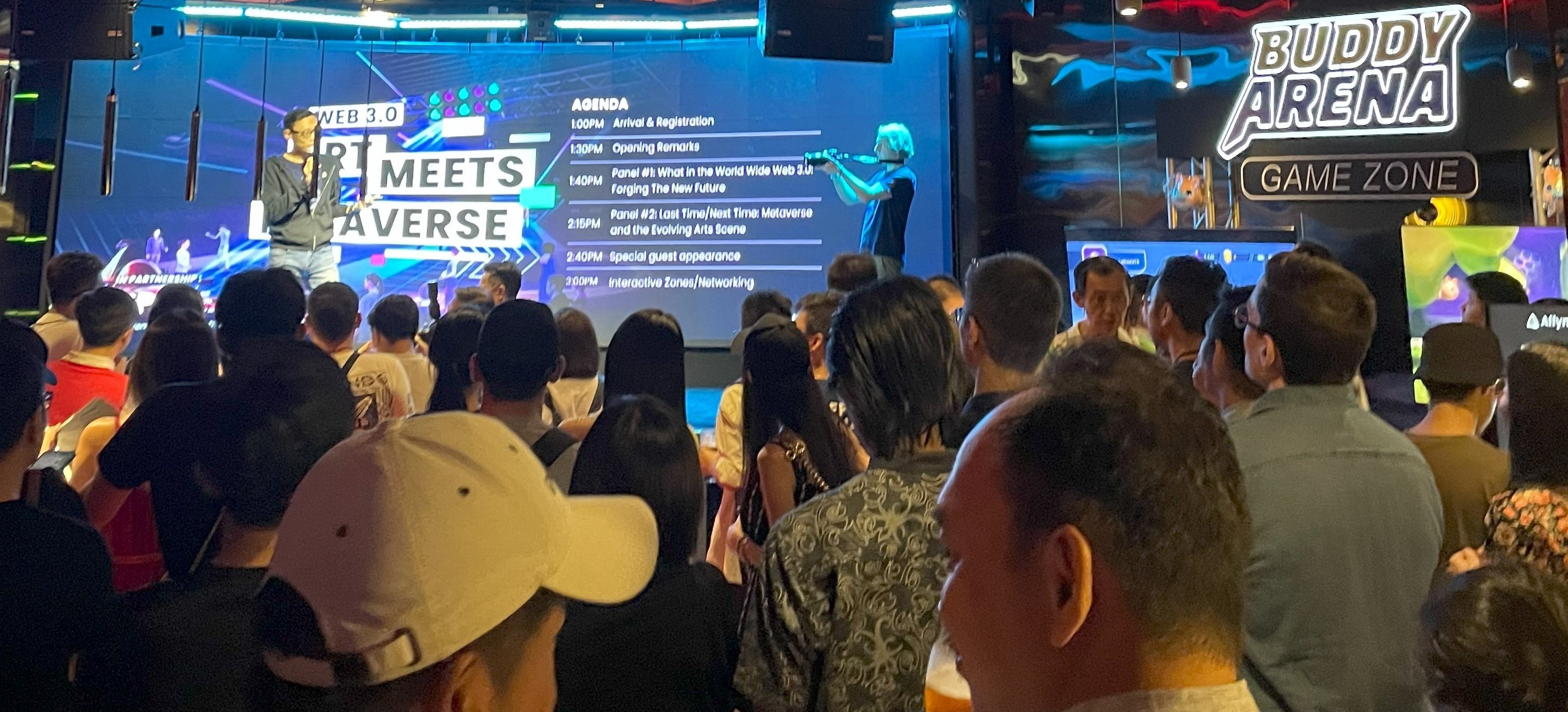 <figure><img src="https://496597420-files.gitbook.io/~/files/v0/b/gitbook-x-prod.appspot.com/o/spaces%2FifWvYgVyMOvtjl8QaVYb%2Fuploads%2Fe9USlqyQmoX6yTaIm2qV%2FPanel%20Discussion.jpg?alt=media&#x26;token=89b59d4d-593d-47b2-aa0a-09cd684870e9" alt=""><figcaption><p>Panel discussion for Metaverse and the Evolving Arts Scene</p></figcaption></figure>